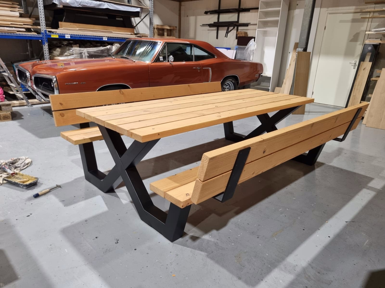 De tafel wordt gemaakt van Douglas houten balken en een metalen frame.